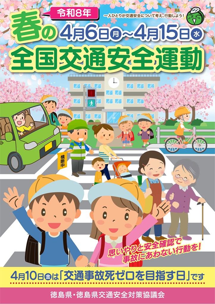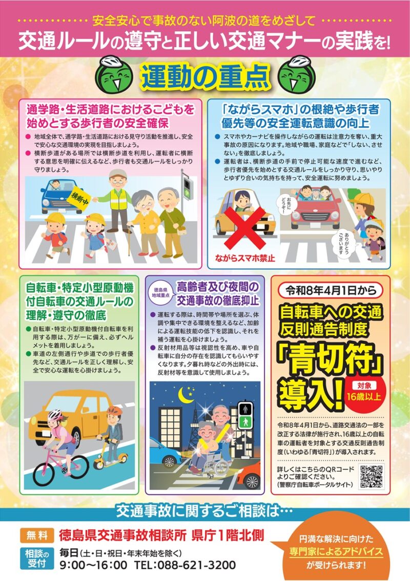 令和8年 春の全国交通安全運動 徳島県 徳島県 2026.03.29 運動実施期間 令和8年4月6日(月)~4月15日(水)の10日間 目次 運動の重点項目令和8年4月1日 道路交通法改正施行 運動の重点項目 全国 通学路・生活道路におけるこどもを始めとする歩行者の安全確保 「ながらスマホ」の根絶や歩行者優先等の安全運転意識の向上 自転車・特定小型原動機付自転車の交通ルールの理解・遵守の徹底 徳島県 高齢者及び夜間の交通事故の徹底抑止 令和8年4月1日 道路交通法改正施行 対象は16歳以上(高校生含む) 悪質な違反は従来通り赤切符(刑事手続き) 携帯電話を手に持って通話したり画面を注視する行為 遮断踏切立入り、信号無視、無灯火、ヘッドホン等の使用など113種類 自動車もルールが変わります 道路状況によるので、数字は目安となります 皆がみんなを思いやって安全・安心な街になります。 さらに詳しいルールを知りたい時は警察庁HPの自転車ルールブックを確認してね